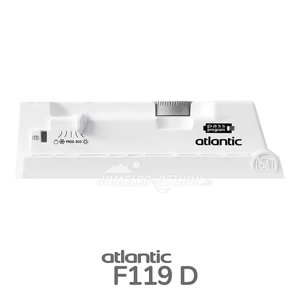 Atlantic F120 D fali elektromos fűtőtest, digitális vezérlésű – elektronikus termosztáttal. Egyszerűsített digitális vezérléssel és szintén 0,1 °C kapcsolási érzékenységgel rendelkezik. Heti/napi programozott időzítőszakok. Szobahőmérséklet és beállított hőmérsékletkijelzés a világító LCD kijelzőn. Comfort, ECO, PROG és fagymentesítő üzemmódokkal. A csomagolás már tartalmazza a fali tartókonzolt.
